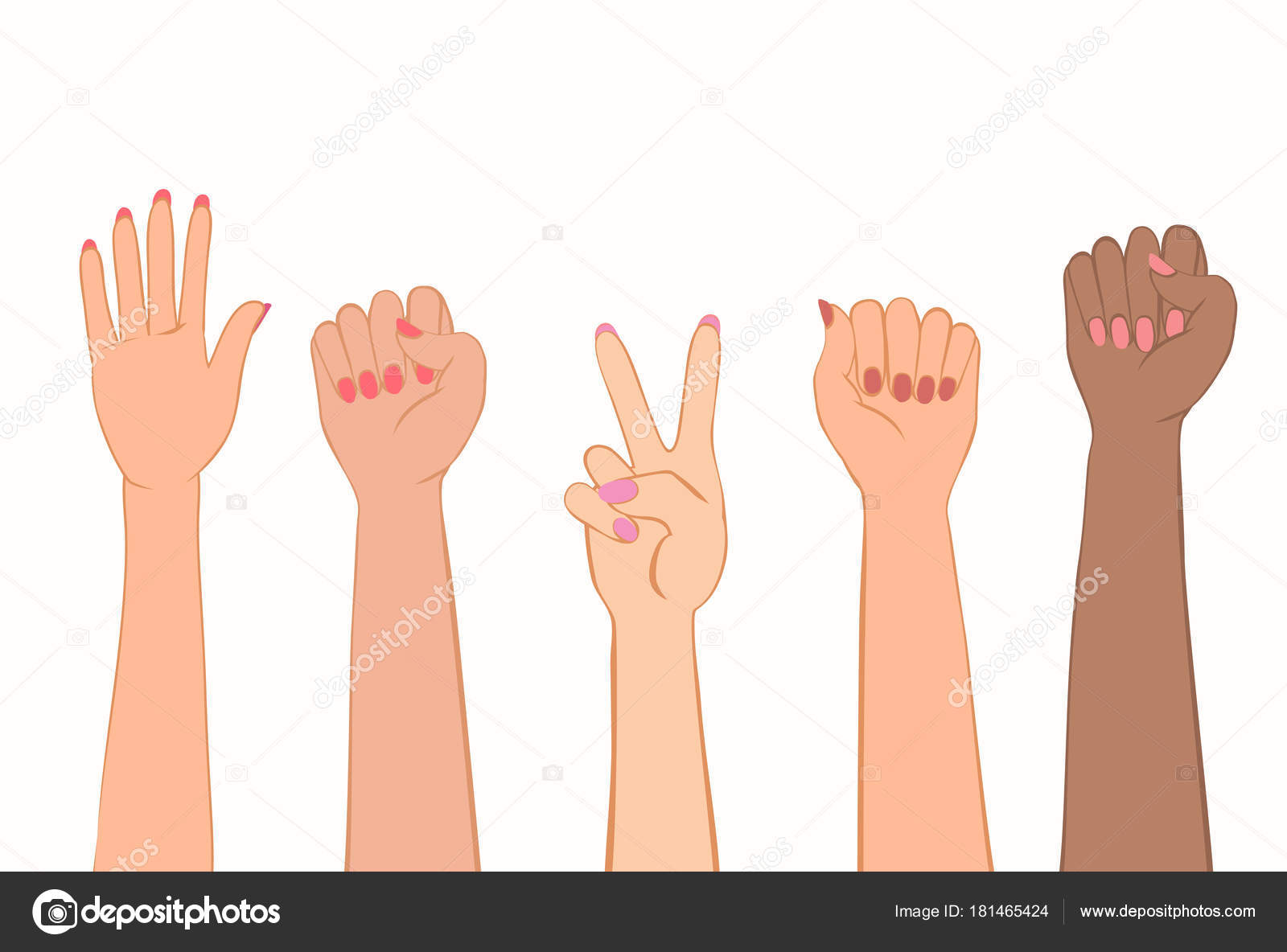 Three Different Skin Colored Female Fists Raised Into Air Arm And Hand Of Women Feminist Pride